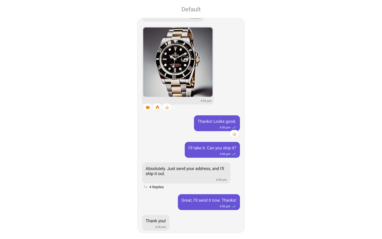 | receiptsVisibility | Used to control the visibility of read receipts without affecting the functionality of marking messages as read and delivered. | receiptsVisibility={true} |
